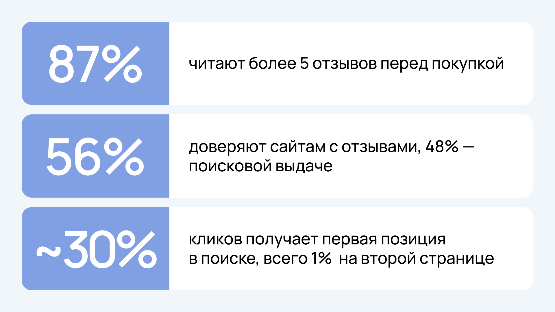 - Согласно данным E-pepper, 87% россиян читают более пяти отзывов перед покупкой—то есть для принятия решения ориентируются на объем мнений.