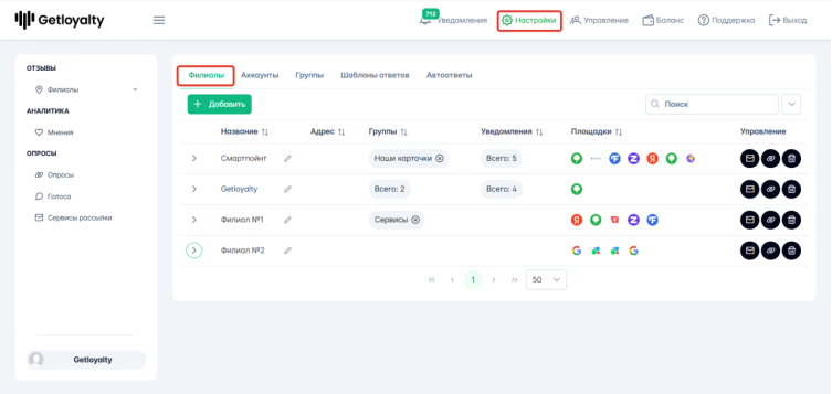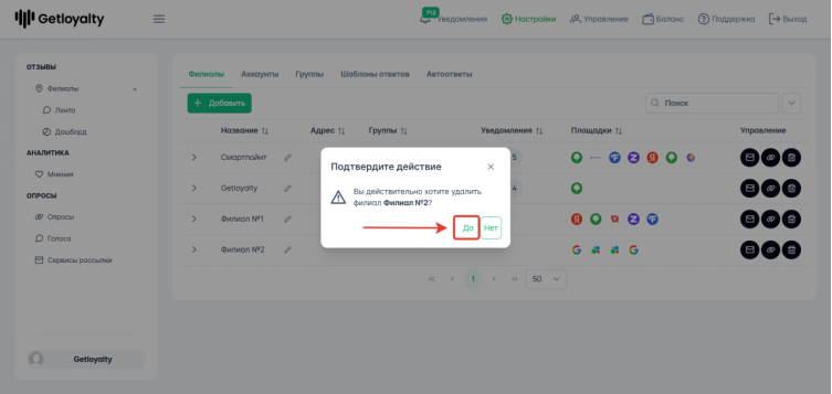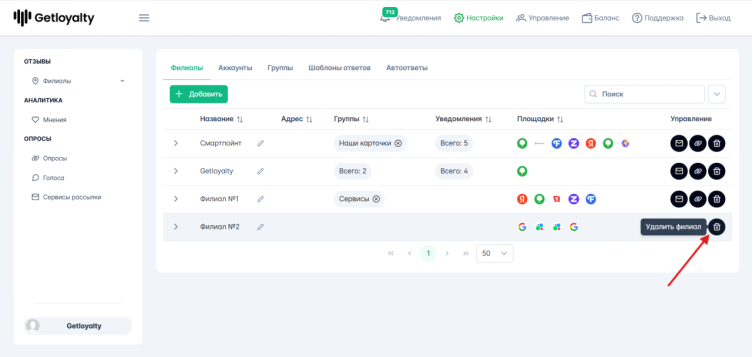 Чтобы удалить филиал, нужно зайти в Настройки - Филиалы.
