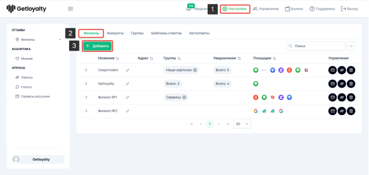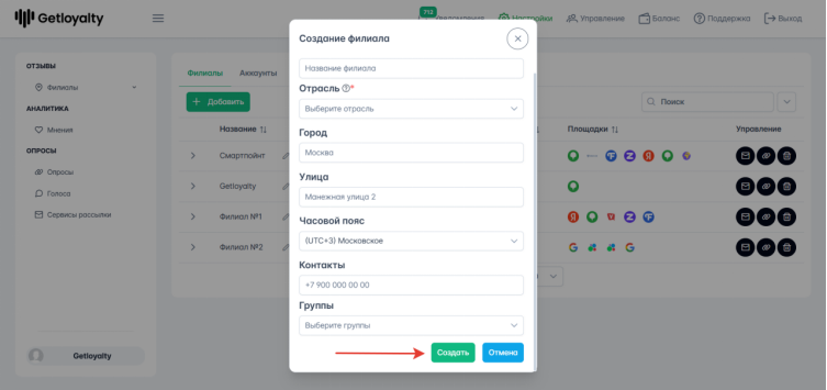 Чтобы добавить филиал нужно зайти Настройки - Филиалы - Добавить. Если кнопка Добавить будет неактивной, это значит, что оплаченный лимит по количеству филиалов достигнут. Для подключения новых филиалов необходимо обратиться в Getloyalty.