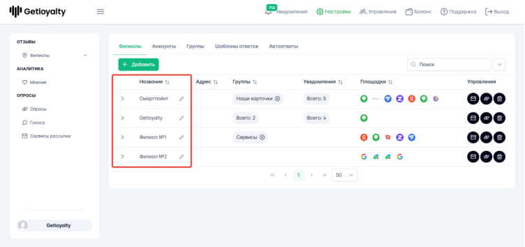 Добавление филиалов