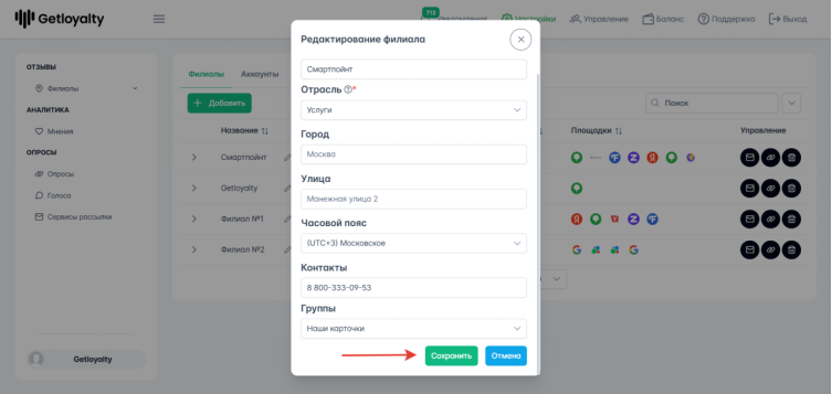 После внесения изменений, обязательно нажмите - Сохранить. По аналогии корректируются данные и в остальных филиалах.