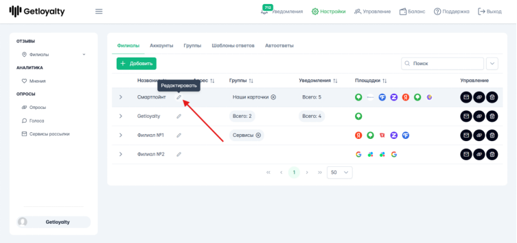 При необходимости данные в филиале можно скорректировать, нажав на иконку - карандаш напротив нужного филиала.