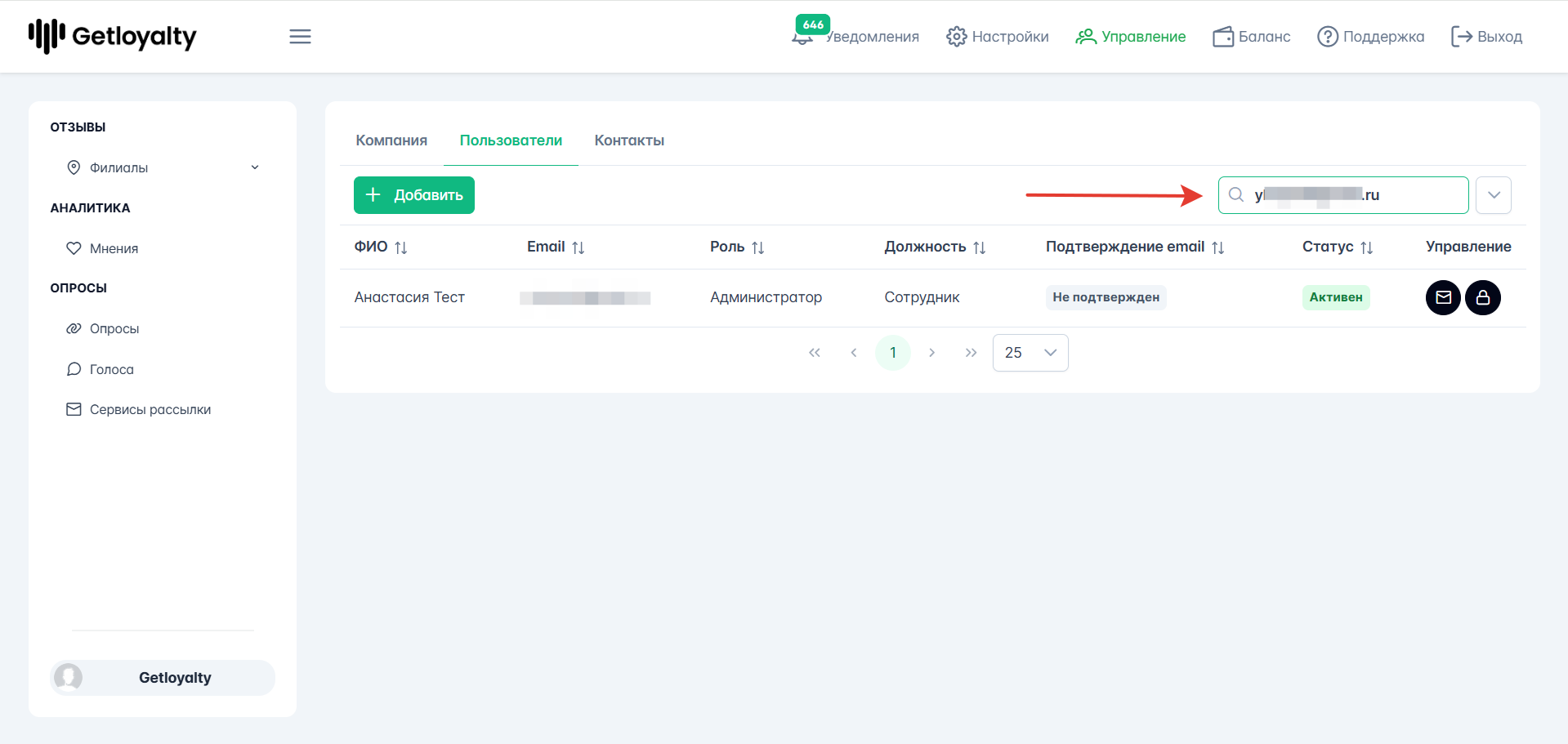 Найти в списке нужного пользователя по почте. Для быстроты можно воспользоваться поиском, указав в поле почту пользователя.