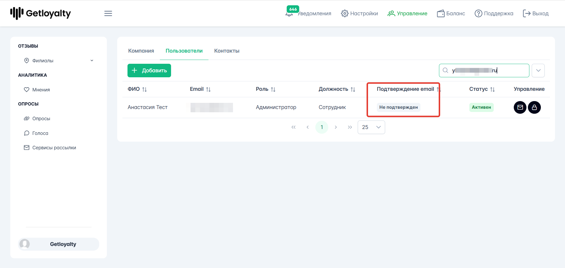 Найдя нужного пользователя, напротив его имени, в столбце Подтверждение e-mail будет написано - Не подтвержден.