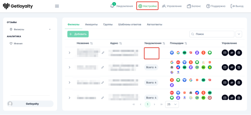 После успешного создания группы и добавления контактов, необходимо добавить группу в те филиалы по которым нужны уведомления. Для этого перейдите во вкладку Настройки и выберите филиал для которого нужно подключить уведомления, а иначе они не будут приходить.