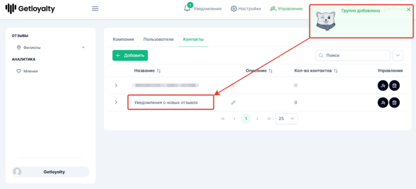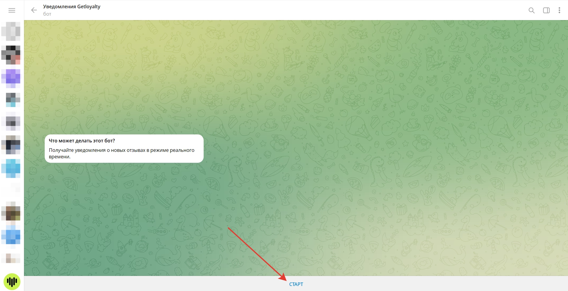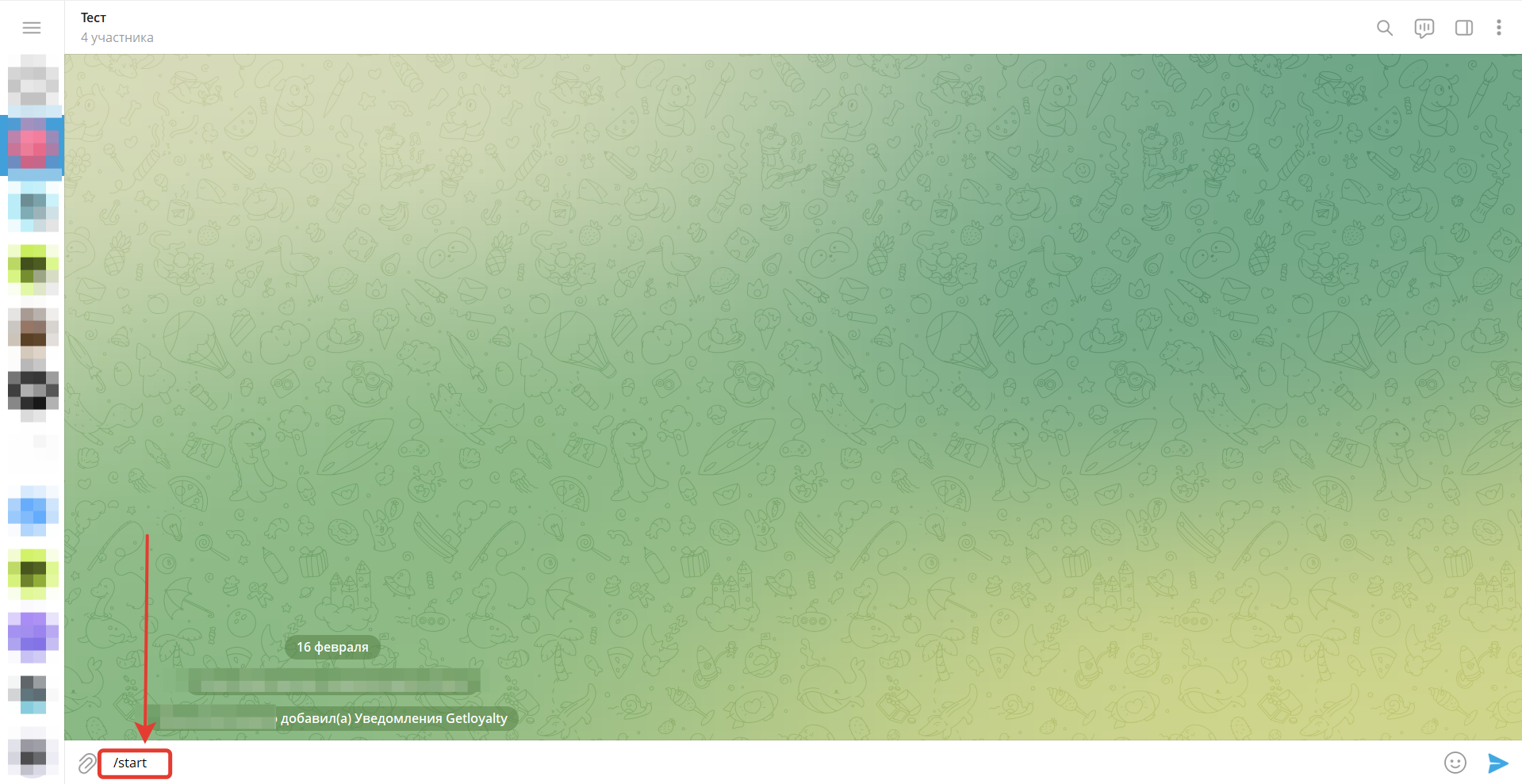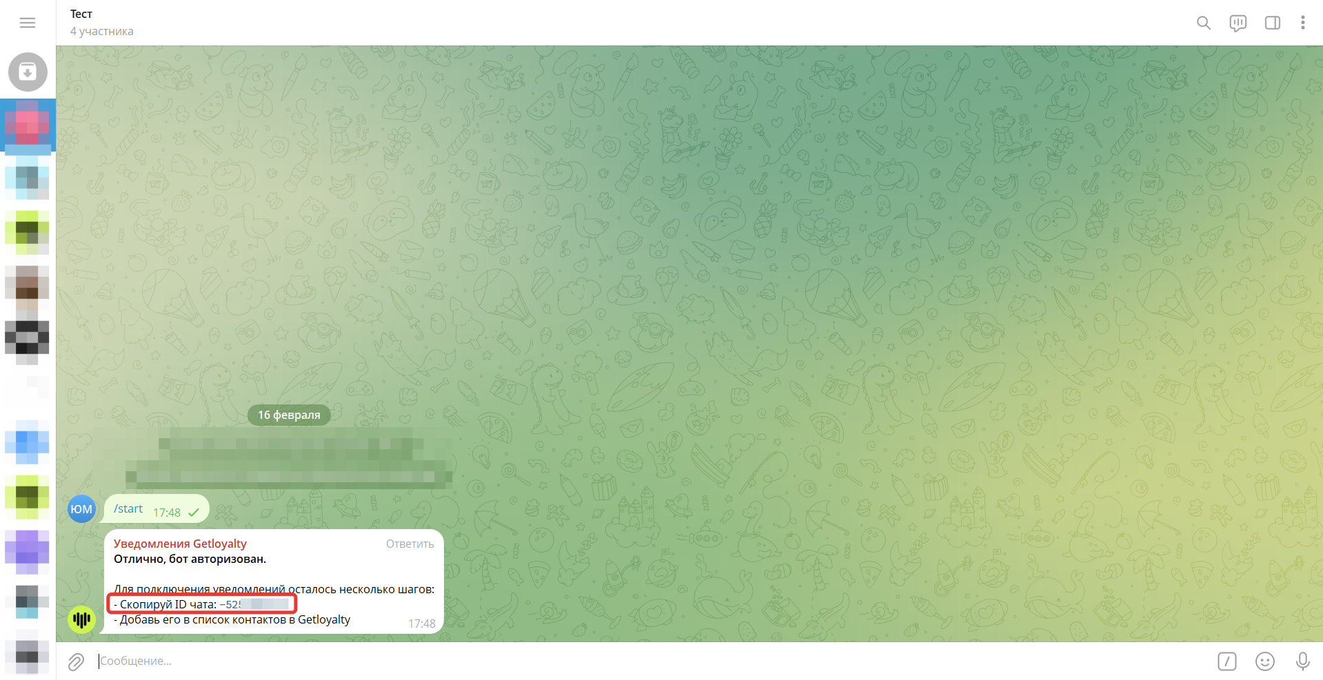 - добавьте в нужную группу бота Getloyalty (бота можно найти по названию Уведомления Getloyalty)