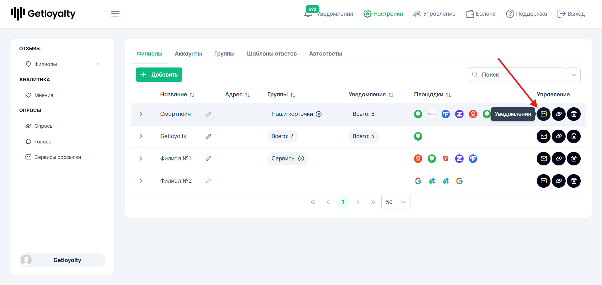 Напротив выбранного филиала нажмите на иконку письма - Уведомления.