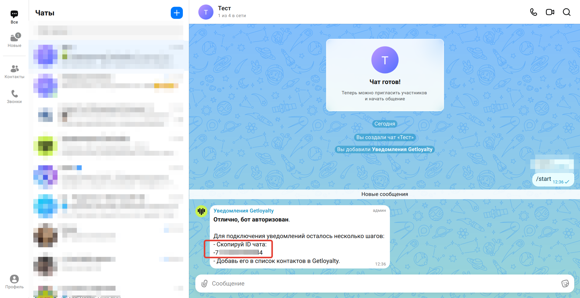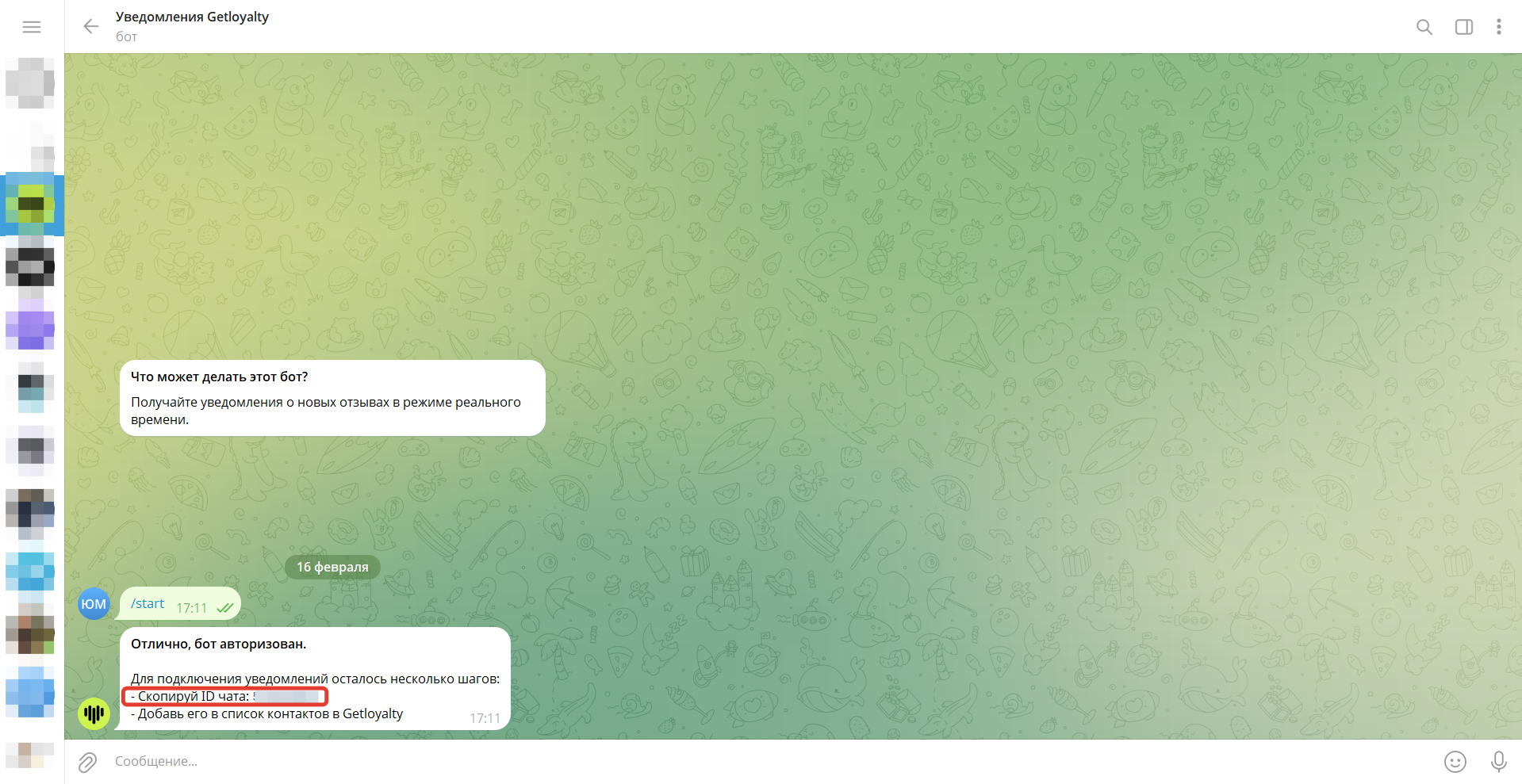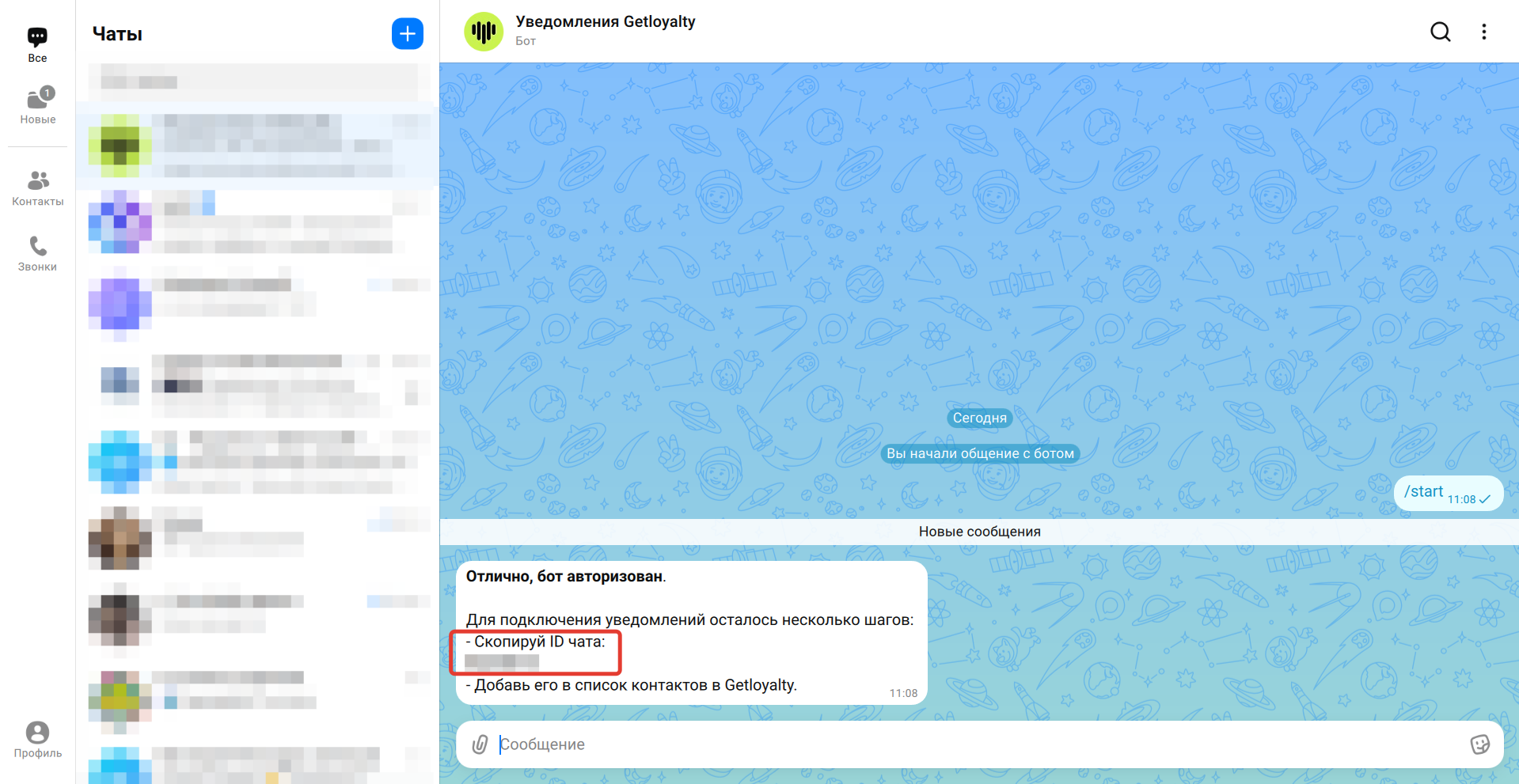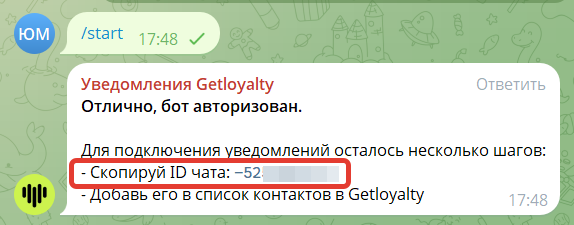 В ответ бот пришлет сообщение с ID чата, который необходимо скопировать для дальнейшей настройки.