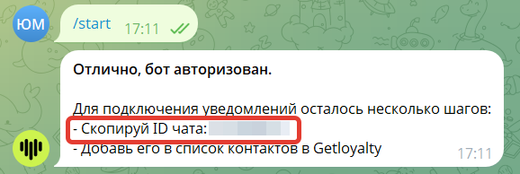 Необходимо скопировать, присланный ботом, ID чата, он будет необходим для дальнейшей настройки уведомлений.