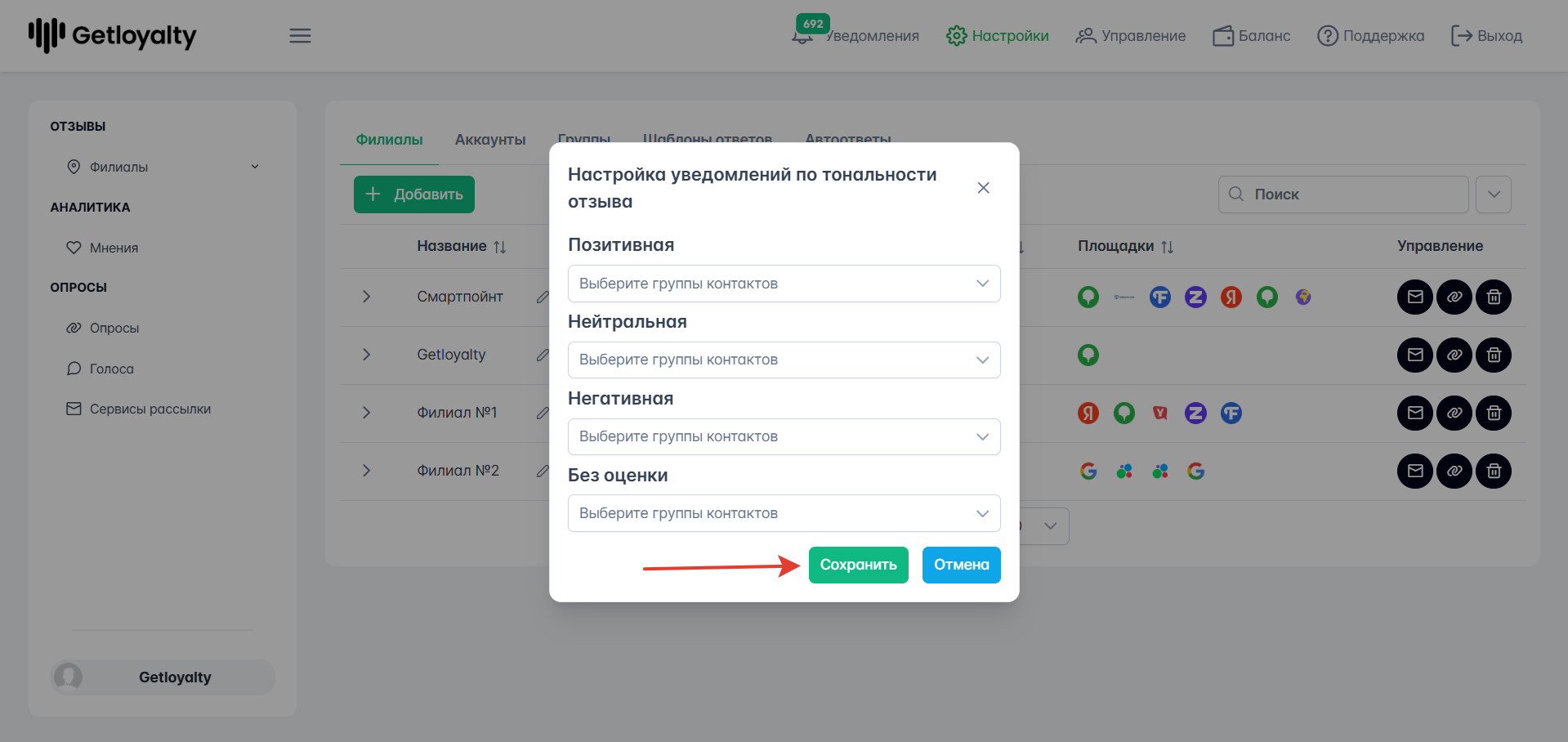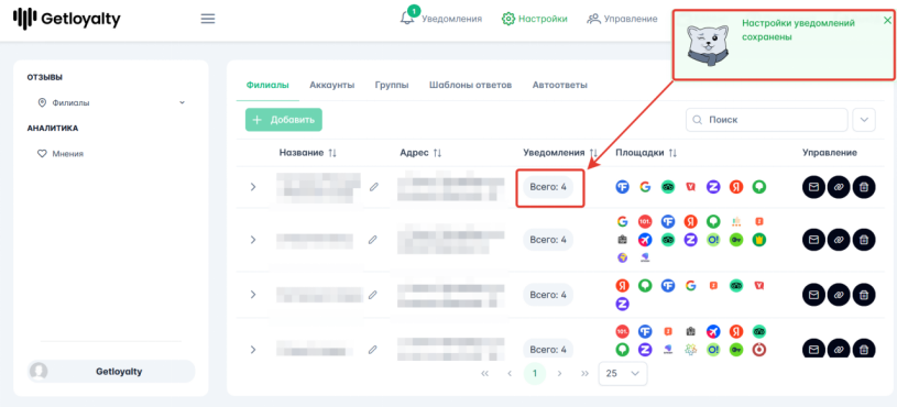 Готово, уведомления настроены по выбранному филиалу. Таким же образом нужно проделать настройки по всем филиалам.