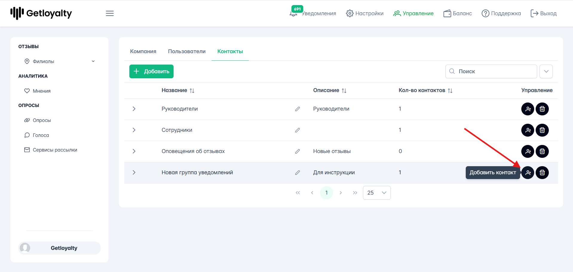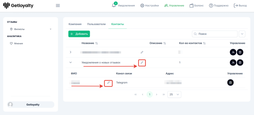 При необходимости можно скорректировать название группы и данные контакта. Для этого нажмите на иконку карандаша напротив названия группы или ФИО контакта. После редактирования данных нажмите - Сохранить.