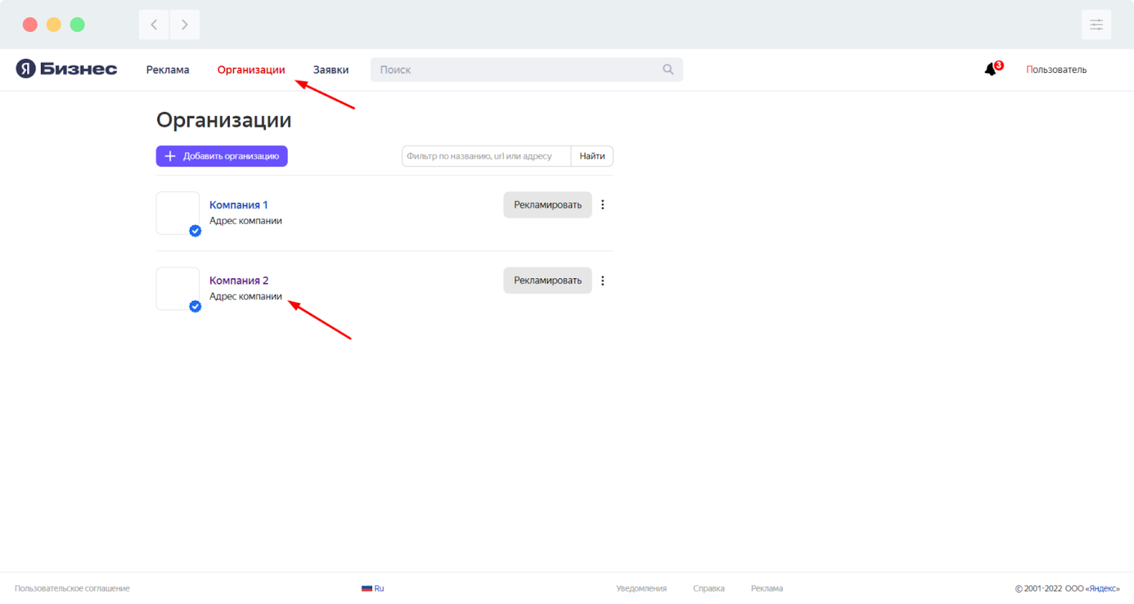 Чтобы открыть доступ представителя на Яндекс зайдите в кабинет Яндекс Бизнес. Перейдите в раздел Организации и нажмите на компанию (филиал, объект), к которому хотите открыть доступ.