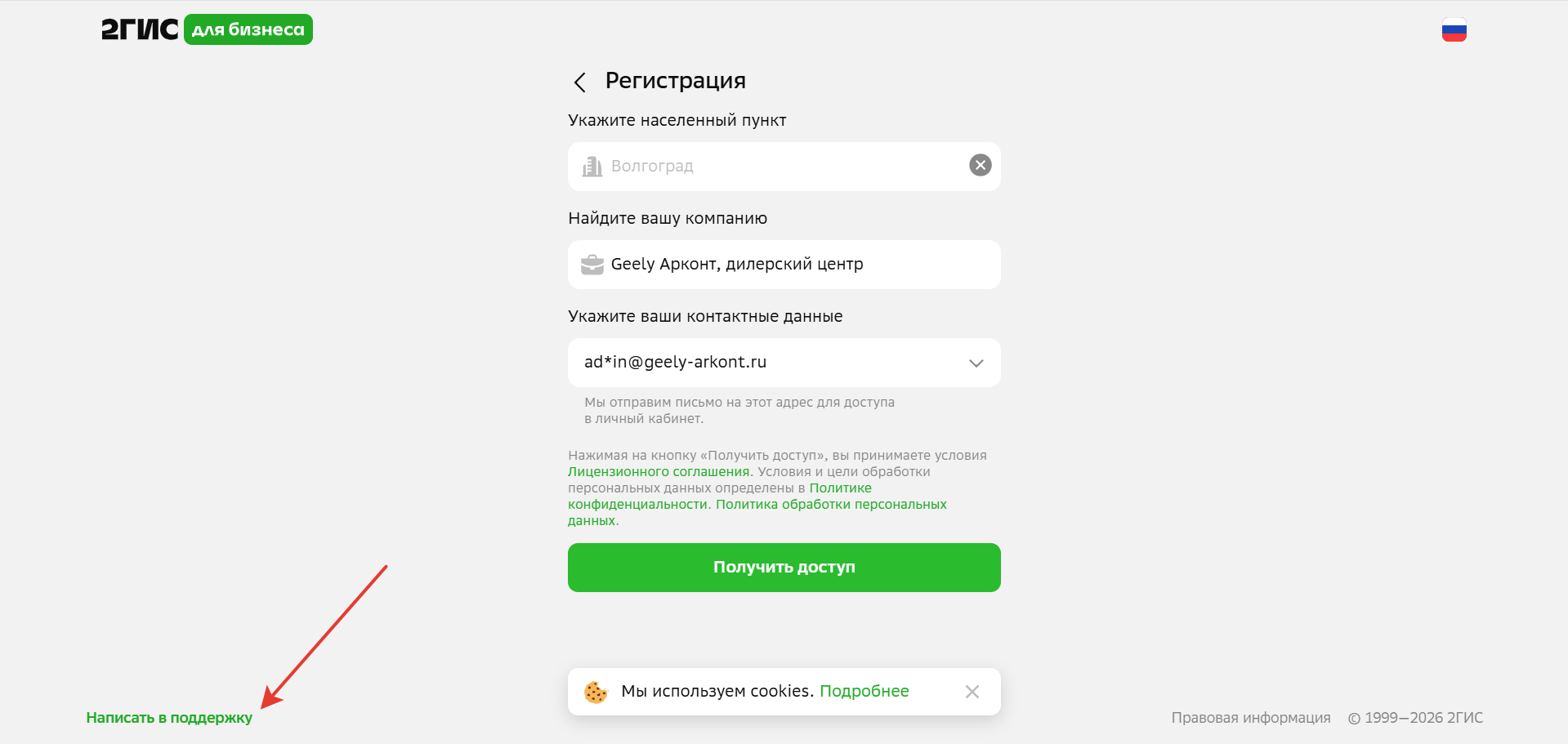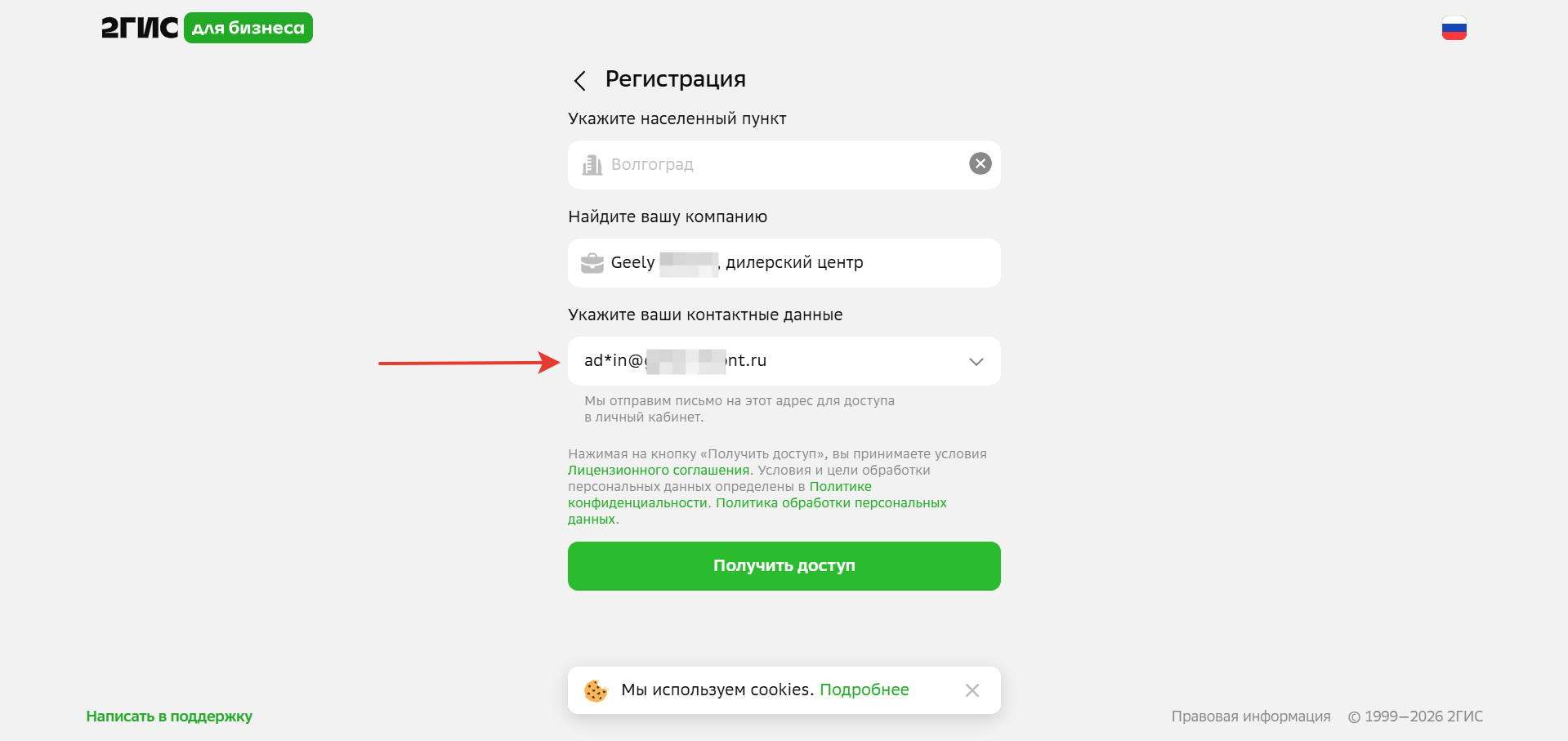В поле Укажите ваши контактные данные будет указана почта на которую зарегистрирован аккаунт в 2ГИС по выбранному филиалу. Зайдя в 2ГИС Бизнес под указанной почтой (если у вас к ней есть доступ) вы сможете предоставить доступ представителя другим пользователям, т.е. на нашу корпоративную почту.