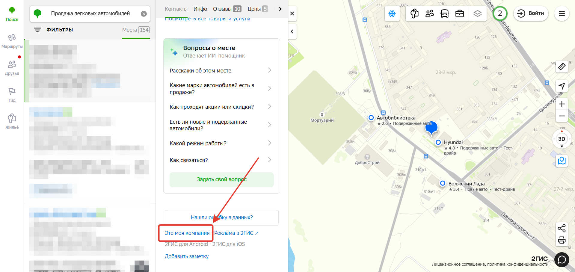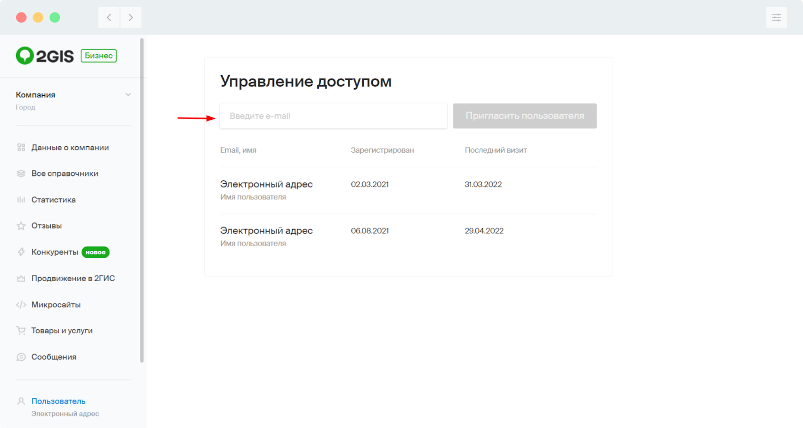 Если кнопка Пригласить пользователя будет неактивной, значит, что вы зашли в 2ГИС Бизнес с аккаунта в котором недостаточно прав для предоставления доступа другим пользователям. Это можно решить следующим способом: перейти в поисковике на карточку нужного филиала в 2ГИС и в самом низу карточки нажать - Это моя компания.
