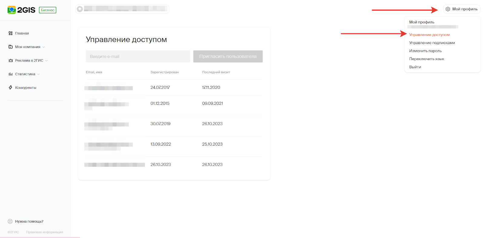 Зайдите в личный кабинет 2ГИС Бизнес. Нажмите на Мой профиль - Управление доступом.