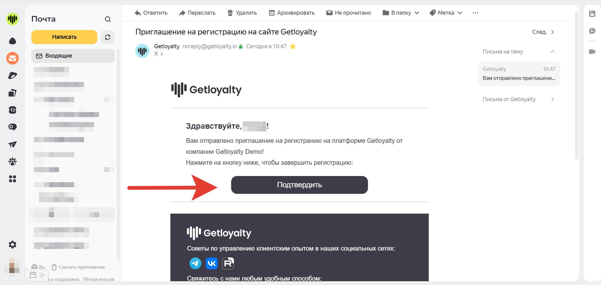 Чтобы войти в Getloyalty, необходимо активировать свой аккаунт. Для активации аккаунта, необходимо дождаться письма с приглашением на регистрацию. Приходит письмо практически сразу после добавления пользователя в платформу. Если вас не добавляли в платформу, то письмо не придет. Также письмо может попасть в папку Спам, поэтому там тоже стоит посмотреть. В письме нужно нажать на кнопку - Подтвердить.
