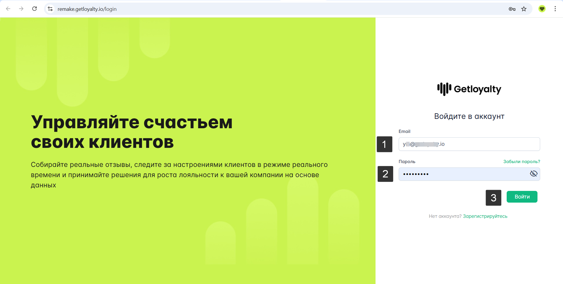 Последующий вход в платформу Getloyalty осуществляется по ссылке: https://remake.getloyalty.io/login