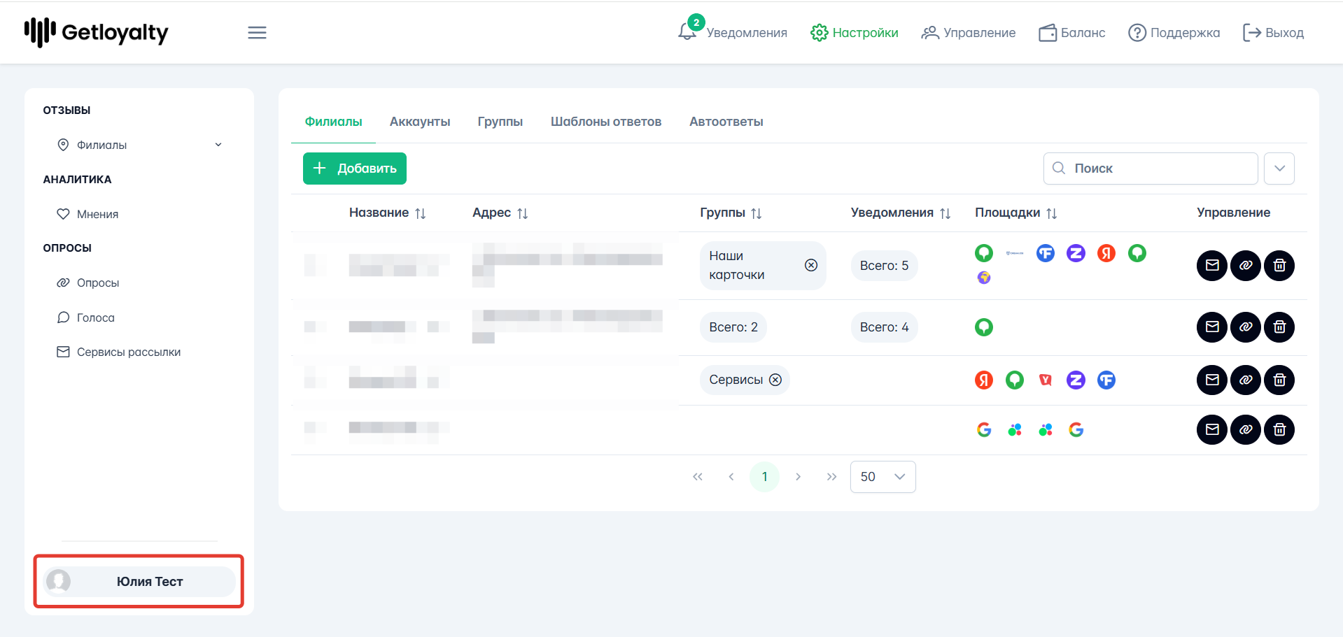 При успешной регистрации, после нажатия на кнопку Войти, вы попадете в личный кабинет Getloyalty. Ваши имя и фамилия в левом нижнем углу подтверждают, что вы авторизованы под своим аккаунтом.