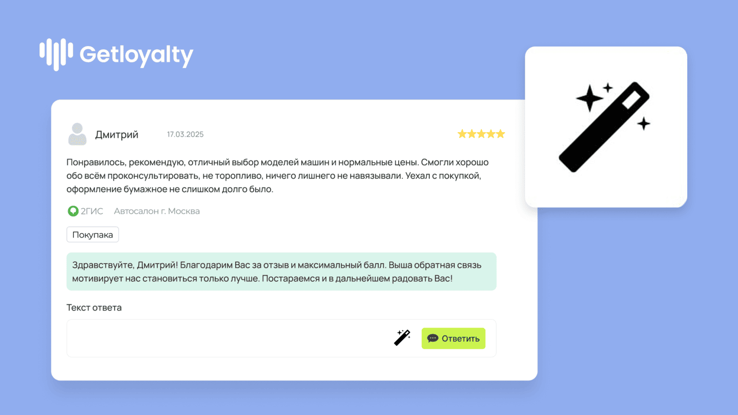 Мы знаем, как порой сложно отвечать на отзывы, подбирать слова и тем более попадать ими точно в цель, поэтому сотрудники Getloyalty изучили десятки тысяч отзывов о ваших компаниях и создали специальный банк шаблонов ответов. Для вас и вашего удобства мы собрали около 4,5 тысяч ответов на самые разные по тональности и сфере деятельности вашего бизнеса шаблоны. Они собраны для упрощения и ускорения процесса коммуникации с клиентами.